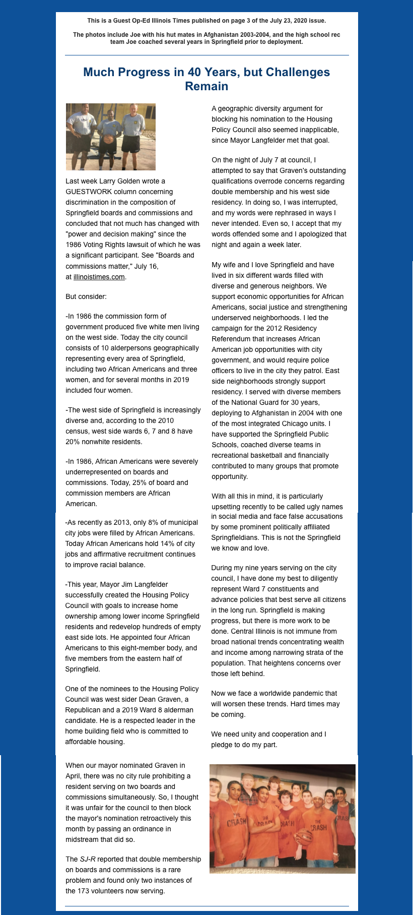 Joe’s Guest Ed Op in the Illinois Times for the July 23, 2020 issue (page 3). The photos include Joe with his hut mates in Afghanistan (2003-2004), and the high school rec team Joe coached several years in Springfield prior to deployment.